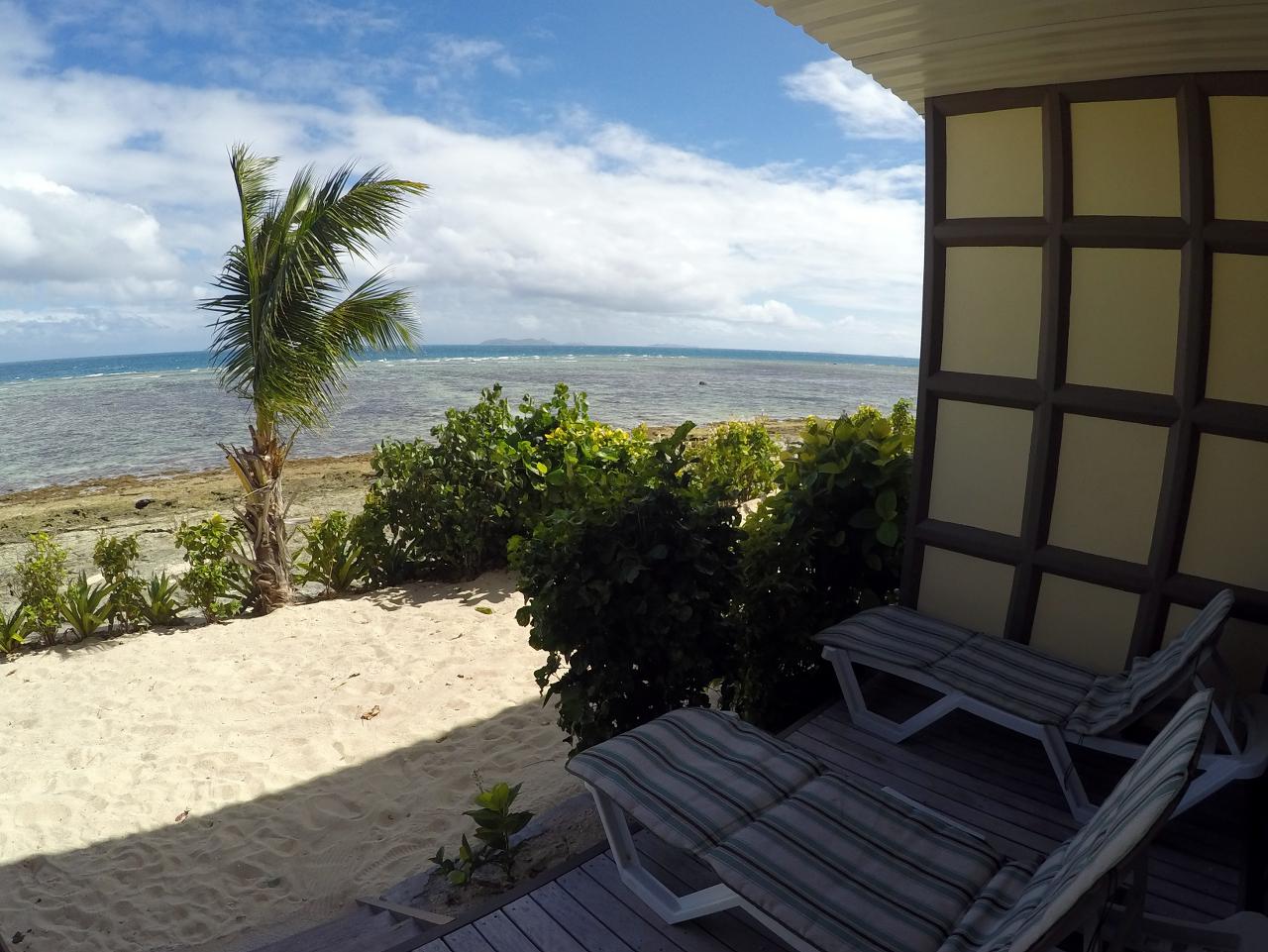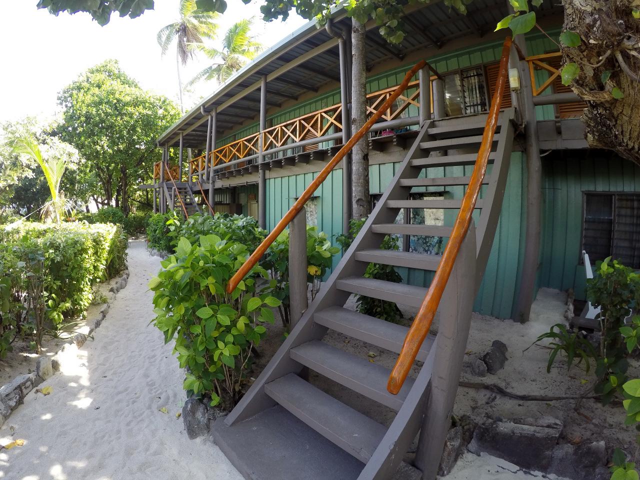 On the opposite site of the island to the restaurant, bar and people. It's really quiet over here. We stayed in a downstairs unit in the middle somewhere. Awesome views and right on the waters edge. Beds are nice big king size and very comfortable, the pic doesn't show it below, but they normally have another single bed in there too. Ensuite, fridge, tea & coffee facilities. Heaps of room. Fully air conditioned. Loungers on the deck. We reckon these rooms are the best if you're budget can afford it.