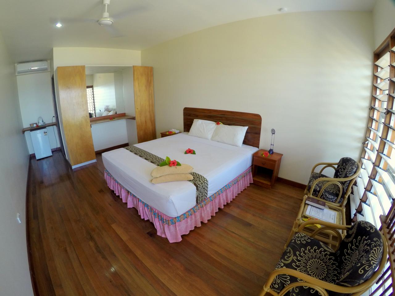 Things have changed over the years at Beachcomber, it's one of the first backpacker resorts on the islands in Fiji and originally only for the young. Now they have beachfront bures and a great block of 16 hotel rooms on the opposite side of the island facing the sunset. These rooms are about a 3+ star quality and very comfortable, especially the modernised bathrooms with fantastic water pressure. This block is called Sun Set View, room keys have SSW on them. In our opinion the only room to stay if you want a really nice private room, actually the beachfront bures are good too. The SSW rooms all have a deck with loungers and right on the edge of the water with stunning views and amazing sunsets. No TV's in any rooms. There is a big screen TV in the bar.