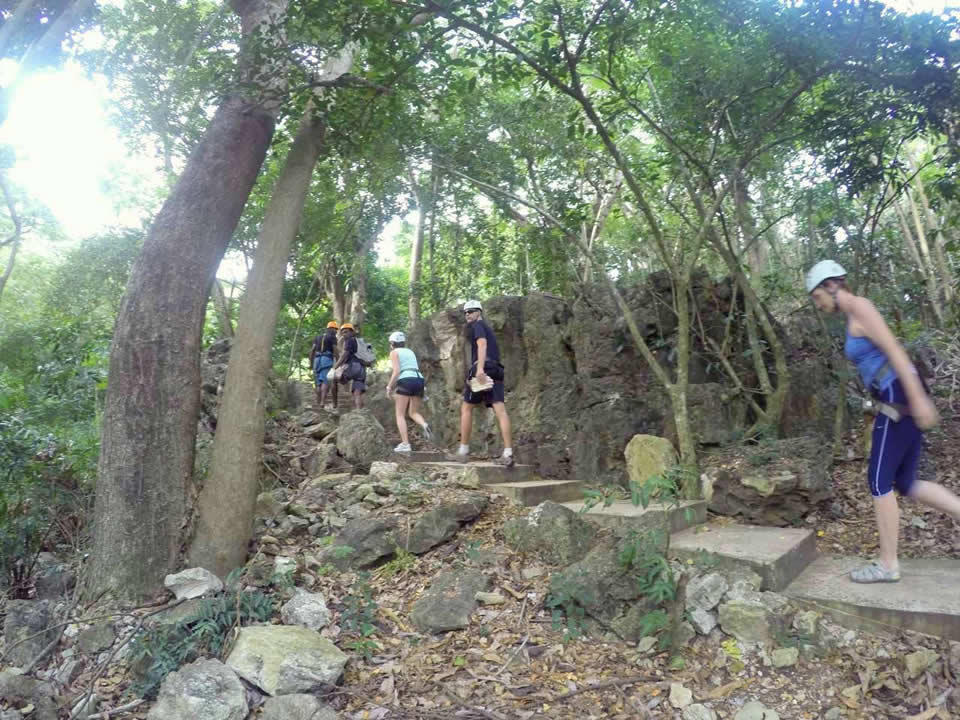 The front of the cave system hereAt the start of the fifth zip line we were standing in front of a massive cave. Instead of hooking up to the zip line we were handed a torch and headed off into this exciting cave. There was ample day light pouring in from a hole in the roof so you could see to the very back of the cave, but the torch did come in handy as you descended the rocky steps.
